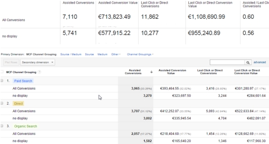 In bovenstaand rapport zie je bovenaan direct de impact van displaycampagnes op de totale omzet. De directe conversie neemt af met 153.000 euro. Je kunt dit afzetten tegen je uitgaven aan display campagnes. Lager in het rapport kun je zien wat de impact is op de andere kanalen. Zo zie je in dit voorbeeld dat de impact op paid search ongeveer 15.000 euro direct is en 70.000 euro assisted.