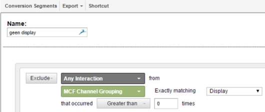 De eerste praktische analyse die ik wil behandelen, komt voort uit de de oervraag bij attributie: wat is de impact van een kanaal op andere kanalen? Voorbeelden hiervan zijn: heeft het zin om te adverteren via display of wat is de impact van Adwords op organic en direct. Een goede aanpak hiervoor is uitgewerkt door Himanshu Sharma van Optimizesmart.com. Om bijvoorbeeld de vraag over het effect van display te beantwoorden doorloop je de volgende stappen.