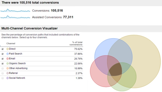 In het rapport zie je dat er nogal wat overlap is tussen de verschillende kanalen. Het is bijvoorbeeld direct duidelijk dat het paidsearchkanaal niet bepaald zelfstandig leidt tot transacties maar sterk samenhangt met de andere kanalen. Helemaal bovenaan staat dat er sprake is van 105.516 conversions en 77.311 assisted conversions. De assisted conversions zijn tot stand zijn gekomen via meer dan één kanaalinteractie.