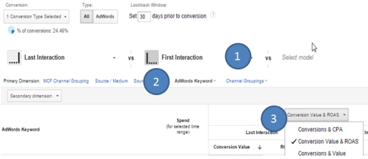 - Vergelijk nu in het rapport dat je krijgt, zowel de first interaction ROAS als de last interaction ROAS van ieder keyword met jouw ROAS norm.