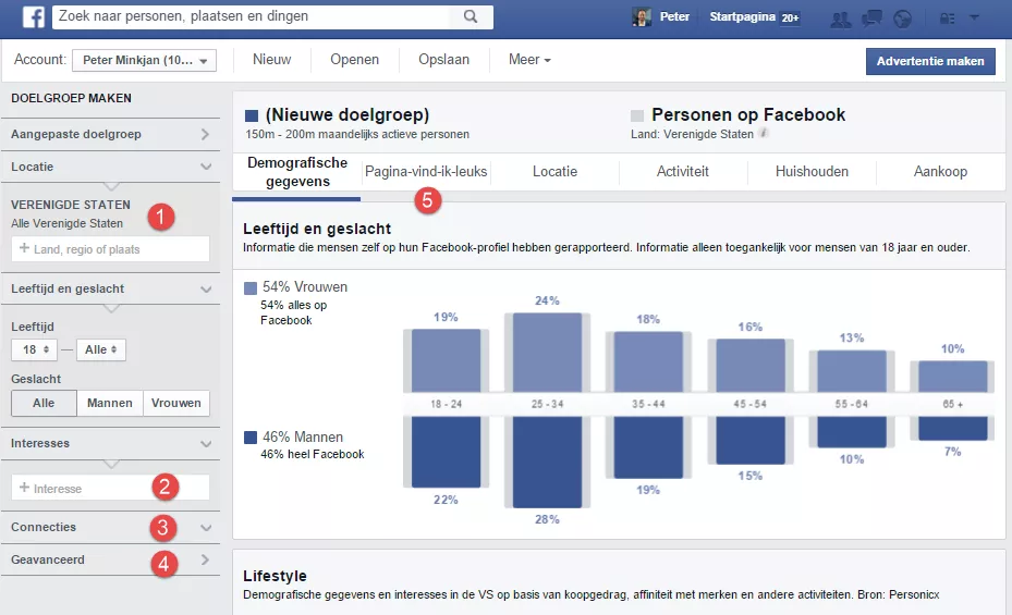 Als je voor het eerst op Audience Insights komt, kan je aangeven of je insights wilt ontvangen van alle Facebookgebruikers, de fans van jouw pagina, of aangepaste doelgroepen. Vervolgens kan je jouw doelgroep specificeren door verschillende variabalen in te voeren aan de linkerkant.
