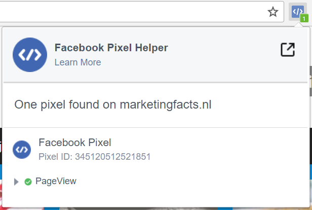 Als je gebruikt wilt maken van website retargeting en conversietracking is het noodzakelijk om een pixel op (een deel van) je website te plaatsen. Om te controleren of deze goed is geïmplementeerd kan je gebruik maken van de Facebook Pixel Helper, een gratis Chrome plugin. Na het installeren van de Pixel Helper zie je bij het bezoeken van een website gelijk of er Facebook pixels zijn geplaatst en of deze correct werken. Wanneer er een Facebook pixel is geïnstalleerd, dan wordt het </> icoontje blauw en geeft het aan hoeveel pixels en events er zijn gevonden. Als er geen pixels zijn gevonden dan blijft het icoontje grijs. Mocht er wel een pixel worden aangetroffen maar laadt deze niet juist, dan geeft de Pixel Helper gelijk aan hoe je dit probleem kan oplossen.