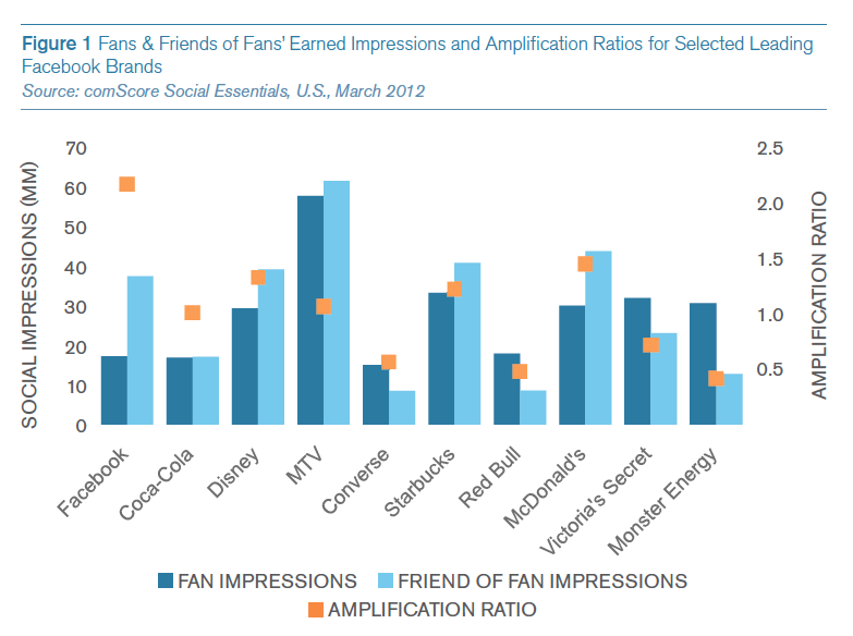 Dit zijn een hoop Engelse termen om te zeggen dat je via je Facebook Fans veel meer Facebook-leden online kunt bereiken met relevante content. In de paper wordt genoemd dat de top Facebook Fanpages een amplification ratio van meer dan 2 kunnen halen. Dus stel dat je 10.000 likes hebt op je Fanpage, dan kan dat bij een succesvolle post een daadwerkelijk bereik van 20.000 Facebook-fans bewerkstelligen.
