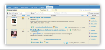 Het is mogelijk berichten naar elkaar door te zetten, de eigen workflow te bekijken en af te vinken als berichten zijn afgehandeld. Daarnaast kan men reageren vanuit het systeem en worden deze reacties opgeslagen in de kalender zodat voor iedereen duidelijk is hoe de webcare verloopt. Rapportages kunnen per dag/week of maand automatisch verstuurd worden en per persoon aangepast worden. Een voorbeeld van de workflow is: