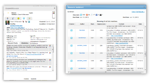 • Het systeem voegt aan ieder bericht of gebruiker een Ranking toe, zodat we op een schaal van 1 op 10 kunnen zien hoe invloedrijk of belangrijk het bericht is. Dit wordt gebaseerd op vele verschillende gegevens zoals: het aantal followers op Twitter, retweets, hoe vaak een persoon listed staat, hoeveel Facebook likes, heeft diegene daarnaast een blog? Hoeveel mensen zijn geabonneerd op de blog en de score in Google resultaten. Daarnaast brengt het systeem ook Topinfluencers in kaart. Met Topinfluencers brengen we in kaart wie of welke bron de zoekopdracht het vaakst noemt.