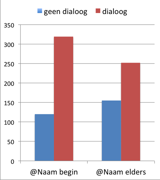 – bij @naam in beginpositie is de verhouding wel / geen dialoog veel sterker ‘in het voordeel van’ wel dialoog (73% / 27%) dan