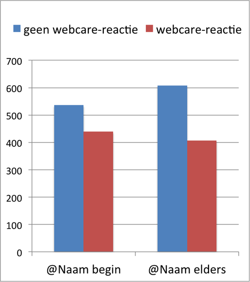 In ons onderzoek bleek de positie van de @naam in de beginpositie dan wel elders in de tweet namelijk significant samen te hangen met de frequentie van een reactie op de tweet én met de frequentie van een dialoog tussen de klagende consument en de aangesproken organisatie. ‘Dialoog’ is in ons onderzoek gedefinieerd als: behalve één webcarereactie van de geadresseerde @naam op de n-WOM-tweet van @gebruikerX is er minimaal één reactie van @gebruikerX op deze webcarereactie. De totale hoeveel interactie-bijdragen is verder buiten beschouwing gebleven.