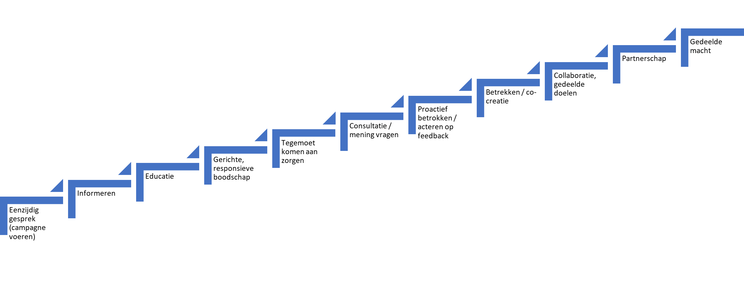 Noot: Figuur vereenvoudigd weergegeven en vrij vertaald, gebaseerd op Stakeholder Engagement ladder van Miles&Ringham, 2019.