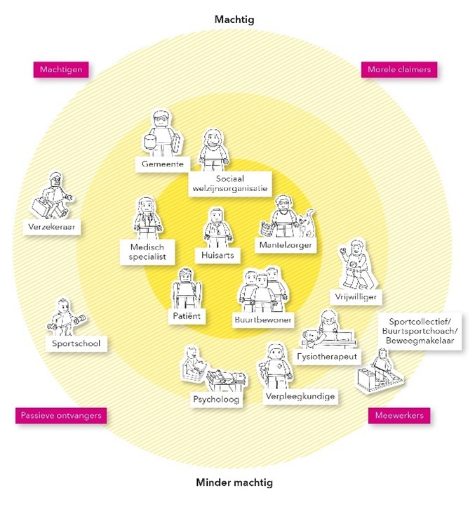 Deze zogenaamde mapping (zie figuur 2) legt bloot waar in het netwerk de meeste zeggenschap ligt. Dit kan vertaald worden naar wie of waar de meeste waarde wordt gecreëerd. In het geval van de beweegzorg: de partijen in het midden bepalen, elk vanuit een andere stakeholdertypologie.
