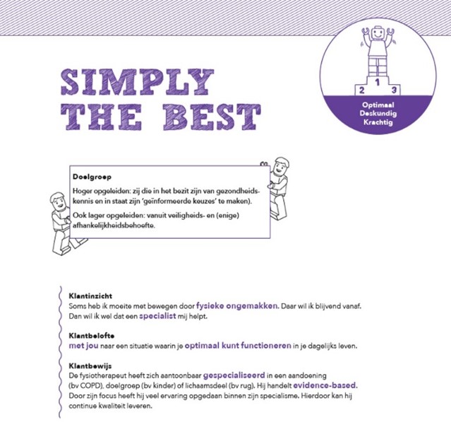 Deze co-creatie – een vorm van gevorderde stakeholderparticipatie – heeft ervoor gezorgd dat fysiotherapeuten en stakeholders samen de fundamenten hebben gelegd van de meaning-making van lokale organisatiemerken. Zoals bijvoorbeeld FysioVitaal. een praktijk in de wijk die zich sindsdien specifiek richt op jongvolwassen (amateur)sporters. Hun merkbelofte is: sterk in je eigen kracht. Concreet vertaald dat zich naar, betere prestaties dan vóór je eventuele blessure. Het is een wijk- en populatiespecifieke vertaling van het positioneringsconcept Simply de Best (figuur 3).