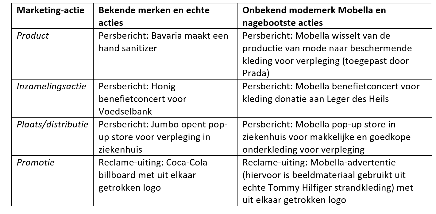 De verschillende, echte, corona-acties werden met de volgende materialen getest bij groepen van elk 100 mensen. In totaal waren er, inclusief twee controlegroepen, 1.000 mensen bij dit experiment betrokken. Er werden vier marketingacties met vier echte merken getest. Daarnaast werden de echte acties ook met het niet bestaande modemerk Mobella getest om te kunnen corrigeren voor merkbekendheid (zie voor meer info het kader).