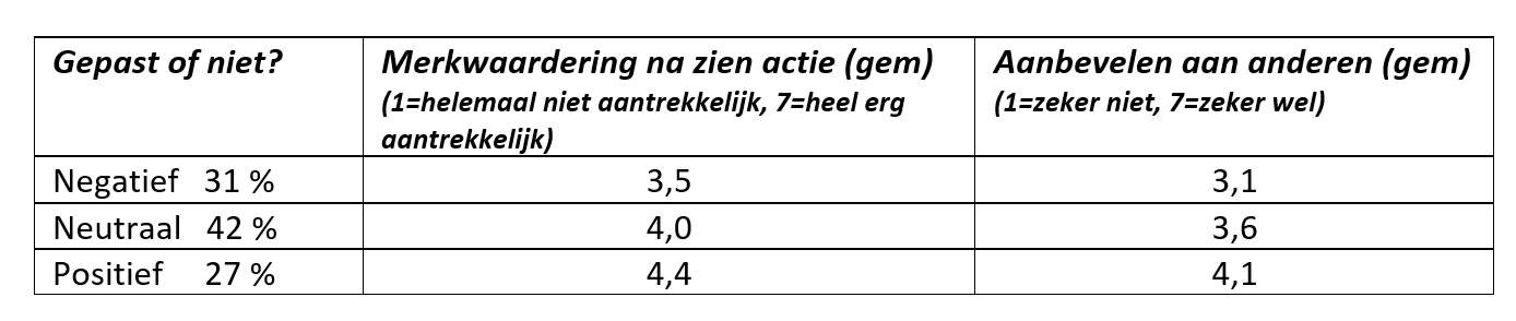 Deze cijfers laten zien dat het uitmaakt voor merkwaardering en -aanbeveling hoe mensen oordelen over de gepastheid van merkacties. De een derde die het op dit moment ongepast vindt dat merken adverteren of anderszins onder de aandacht proberen te komen, geven een behoorlijk lagere merkwaardering en zijn ook echt minder geneigd om merken aan te bevelen. Vindt men het aan de andere kant wel gepast, dan leidt dat ook tot een hogere waardering en aanbeveling.