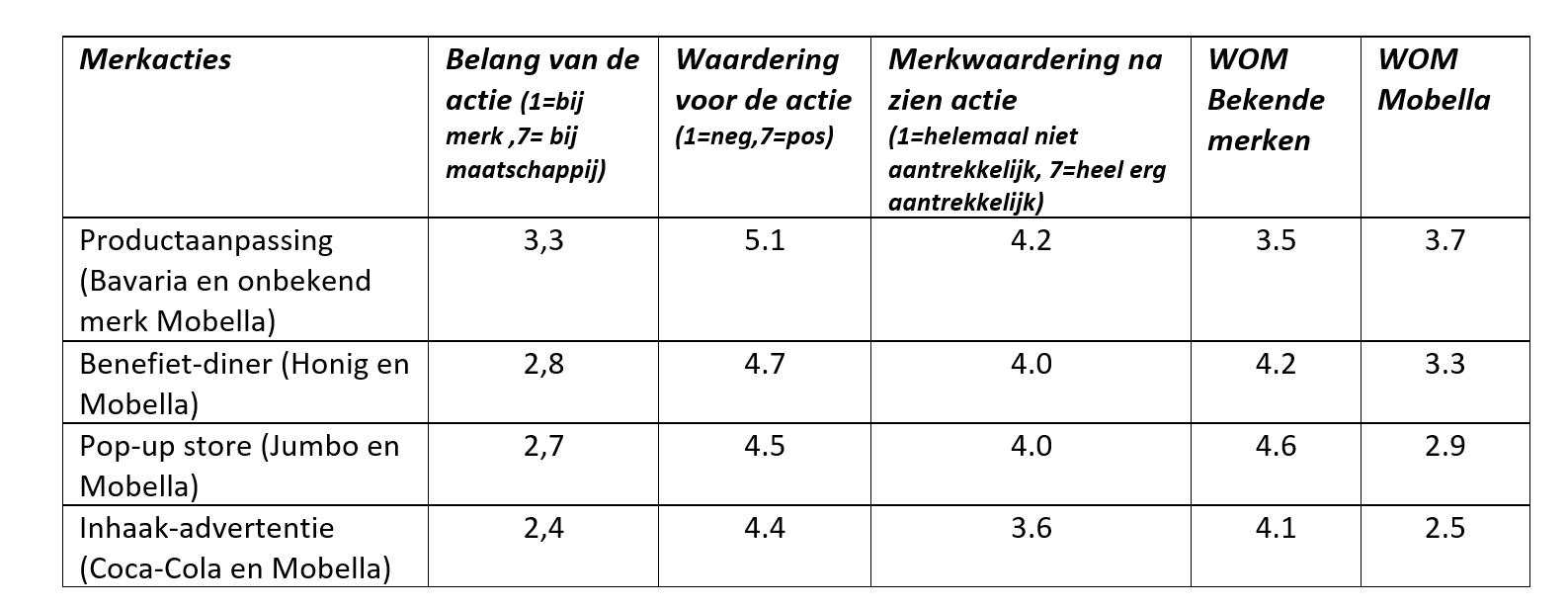 De laagst scorende was telkens de inhaakadvertentie (de gemiddelden staan hieronder). Naarmate de actie dus werd gezien als grotere bijdrage aan het maatschappelijk belang, hoe hoger de waardering voor de actie zelf en de merkwaardering werden.