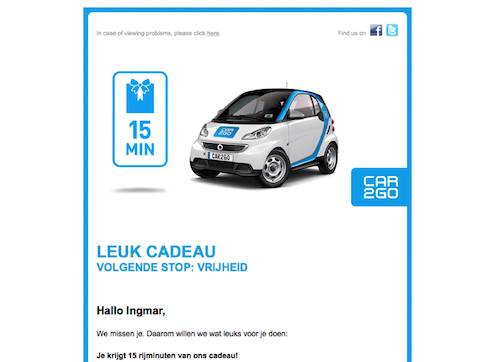 Van Car2go kreeg ik een andere aansporing, een activatiepropositie. Vanuit het niets kreeg ik een mailtje met een leuke aanbieding: ik kreeg vijftien rijminuten cadeau. Een ritje duurde voor mij gemiddeld vijf minuten. Dus ik kreeg drie ritjes, voor niets!