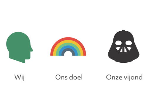 Je kunt ook een denkbeeld als tegenstander hebben: jouw merk spreekt zich duidelijk uit tegen racisme. Zelfs het eigen bedrijf kan een tegenstander zijn, bijvoorbeeld bij een reorganisatie: “We gaan het gevecht aan met onze oude denkbeelden.” Voor de volledigheid: dit betekent niet dat je tegenstander met naam en faam op je homepage hoeft te staan. Belangrijk is vooral dat wanneer je weet waar je tegen bent, je ook beter weet waar je voor strijdt. De drijfveer van je merk wordt duidelijker.