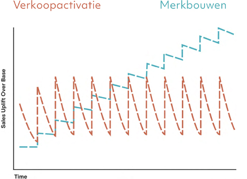 Verkoopactivaties werken een stuk sneller. Slimme promoties zorgen dat verkopen vrijwel direct omhoog schieten. Maar als de promotie is afgelopen, zakt het marktaandeel weer terug naar de basis en is er geen significant effect geweest op de reputatie van het merk, zie de rode lijn.