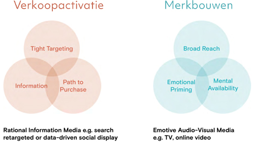 Verkoopactivaties zijn belangrijk, maar ze zorgen niet voor significantie groei. En wat valt volgens Binet en Field onder verkoopactivatie? Zie het linkerdeel van het bovenstaande plaatje. Scherpe targetting, praktische informatie, slimme aankoopoptimalisatie, SEO en data. Inderdaad, dit zijn veelgebruikte instrumenten uit de gereedschapskist van de groeimarketeer.