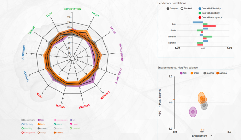 Interessant, zulke grafieken, maar wat willen ze zeggen? Finzie scoort vooral op ‘trust’ veel beter dan de andere namen. Iets wat voor een financieel dienstverlener toch wel prettig is. Interessant is ook om te zien dat Fink erg achterblijft in positieve beleving en engagement (zie de tabel rechtsonder). De naam scoort ook opvallend hoog op ‘danger’. Associëren we Fink met ‘Flink’? En daarmee met iets groots en bedreigends? Of roept het misschien de associatie op met ‘think’ en is ‘danger’ daarmee gekoppeld aan alertheid? Dit is gissen, maar het uiteindelijke effect is ontegenzeggelijk.