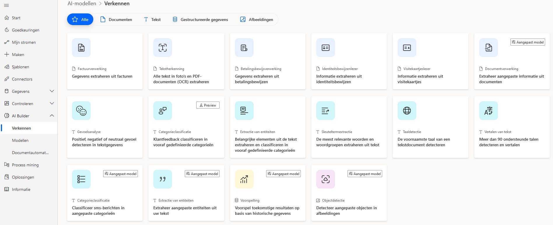 Zo biedt Microsoft voor veelvoorkomende businessproblemen al kant-en-klare AI-modellen aan via zijn AI-builder. Ook andere aanbieders hebben toepassingen klaarstaan om je data te classificeren. Enkele voorbeelden: OpenCV, Spacy en Prodigy. En als het om regressie / voorspellen gaat zijn dit enkele opties: H2O.ai, Obviously.ai, Expoze.ai