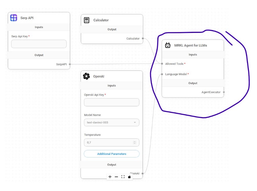 Afbeelding: schema in Flowise van een agent die een model, een API en een calculator aanroept