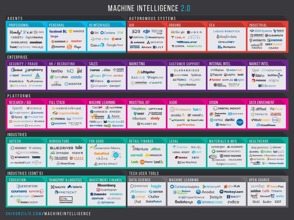 Door de opkomst van spraakgestuurde technologie als Amazon Alexa en de ontwikkeling van smart devices, zoals Samsung Smart Things, wordt intelligence steeds meer een commodity. Kijk bijvoorbeeld naar onderstaand overzicht van machine-intelligencetools die er nu al beschikbaar zijn.