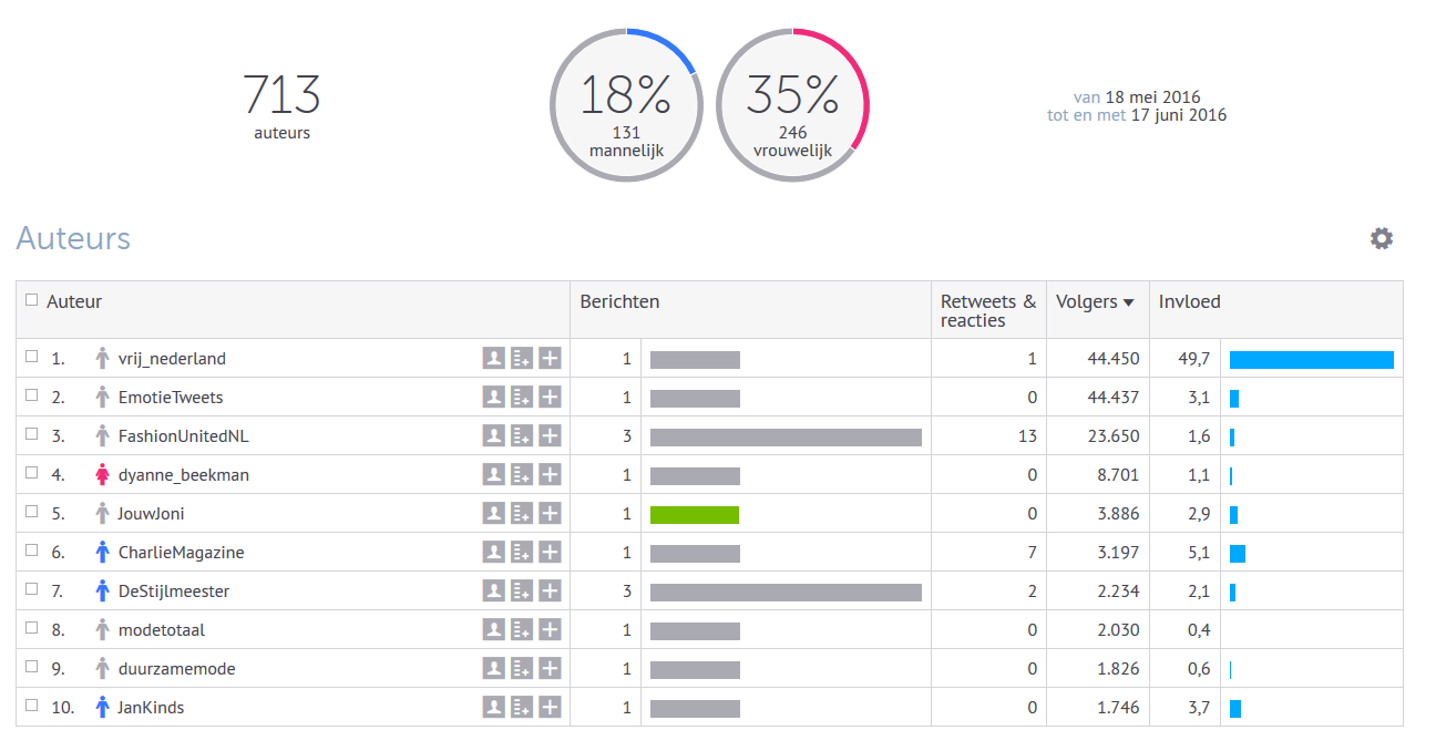 Voor wie het wil testen: Coosto heeft ook een open en gratis testvariant. Vul de onderwepen in waarop je wilt zoeken en klik op auteurs in de linkerkolom. De mogelijkheden hiervan zijn wel beperkter dan die van de betaalde versie. De voorbeelden hier zijn gemaakt met de betaalde variant van Coosto.