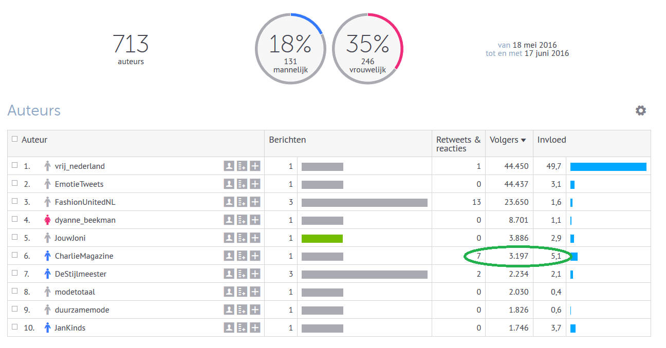 Dit overzicht kun je gebruiken om mogelijk interessante auteurs te vinden. Op basis van het aantal volgers, reacties en invloed lijkt bijvoorbeeld ‘CharlieMagazine’ een interessante auteur om eens nader te onderzoeken.