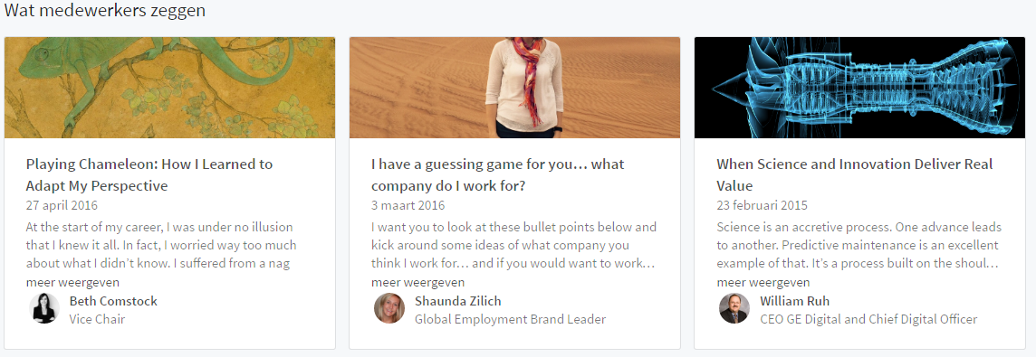 In plaats van één video kun je nu meerdere video’s plaatsen. In het voorbeeld van GE tel ik er al vier. Afhankelijk van je doel met deze pagina biedt het je de mogelijkheid onderdelen van de organisatie uit te lichten. Denk aan de cultuur, de visie of de maatschappelijke betrokkenheid van de organisatie. In plaats van een alinea tekst is het voordeel dat je een langere boodschap op een aantrekkelijkere manier kunt weergeven.