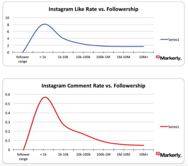 Als je zelf al een beetje actief bent op Instagram zie je het al snel, maar ook het Onderzoek van Markerly in 2016 laat zien dat Instagramaccounts met veel volgers juist lager scoren op zowel likes als betrokkenheid.