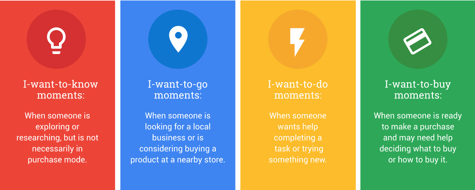 Een aantal jaar geleden introduceerde Google het begrip ‘micro-moments’. Micro-moments zijn de vele korte momenten waarop we ons richten tot een digitaal communicatiemiddel. Dit kan een telefoon zijn, maar ook een tablet, computer, smartwatch of digitale assistant. Deze momenten zijn soms maar een paar seconden lang – Hey Siri! Waar is de dichtstbijzijnde pizzeria? – maar kunnen ook langer duren. Ook het opzoeken van een locatie op Google Maps of het checken van klantbeoordelingen van de laptop die je misschien wilt aanschaffen kunnen worden gezien als micro-moments. Google onderscheidt vier typen micro-moments: Het I-want-to-know-moment, het I-want-to-go-moment, het I-want-to-do-moment en het I-want-to-buy-moment.