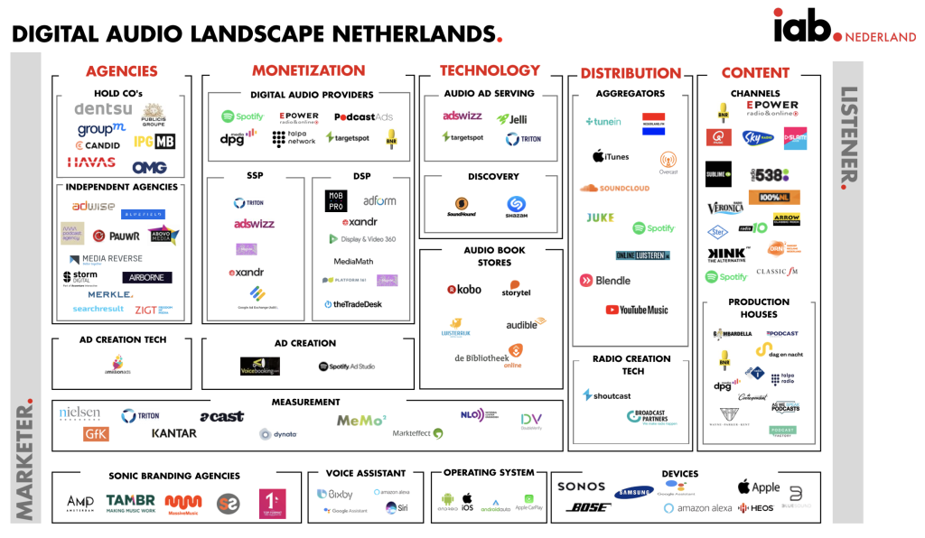 Dat audio een steeds grotere rol gaat spelen in de het communicatielandschap zal voor niemand meer een verrassing zijn. We zien nu een werkelijk een landschap aan mogelijkheden ontstaan. En volgens mij staan we nog maar aan het begin. De IAB Taskforce Digital Audio publiceert de eerste overzichtskaart van de Nederlandse digitale audiomarkt. Met het overzicht wil de taskforce marketing- en communicatieprofessionals inzicht bieden in de verschillende partijen die in het domein digital audio in Nederland actief zijn. De ontwikkeling van digital audio in Nederland heeft de afgelopen periode een flinke vlucht genomen. Inmiddels luisteren miljoenen Nederlanders via een connected device naar podcasts, streamingdiensten en live-radio, en uit de Online Ad Spend Study 2019 blijkt dat de bestedingen binnen podcasts, muziekstreamingdiensten en digitale radio in een jaar tijd met 44 procent zijn toegenomen. Ook in Europa zijn de verwachtingen van digital audio hooggespannen. Onderzoekers van IAB Europe verwachten dat de ad spend van digital audio in 2023 rond de 1,3 miljard euro zal liggen.