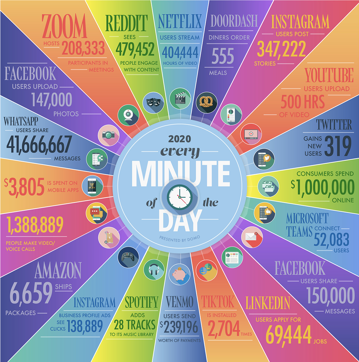 We kennen allemaal de infographic-achtige plaatjes van wat er allemaal in één internet minuut wereldwijd aan activiteit te meten is. Die doen het uiteindelijk altijd erg goed in een presentatie voor de board waar er nog steeds mensen zijn die niet de impact op hun netvlies hebben. Er is weer een update voor het jaar 2020. Los van de indrukwekkende cijfers geven ze over tijd ook wel een mooie trend weer van de contextuele verandering. Zo zien we dit jaar het thuisbezorgen en de videomeetings opeens verschijnen. Meer dan 200.000 Zoom-hosts in één minuut. Voor de vergelijking, hier is nog een overzicht van 2013. En daar staat dan zowaar nog een tool met de naam Skype!