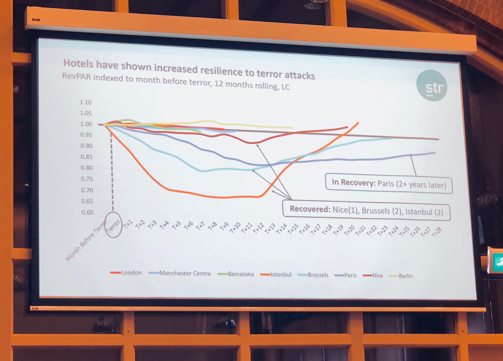 De afgelopen vijf jaar heeft de vraag naar hotelkamers in Europa het aanbod ingehaald, stelt Natalie Weisz (onderzoek en analyse manager van STR). Terrorisme heeft gezorgd voor een flinke daling in bepaalde steden, maar niet alle steden hebben er last van gehad. Londen, Manchester, Barcelona en Berlijn zijn nog steeds populair. Parijs heeft de meeste last ondervonden: de stad is zich na de aanslag van 2015 nog aan het herstellen en zit nog steeds niet op het aantal overnachtingen van voor de terroristische aanslag. De steden die één a twee jaar de tijd nodig hebben gehad om te herstellen zijn Nice, Brussel en Istanbul. Sinds afgelopen jaar gaan die steden weer goed.