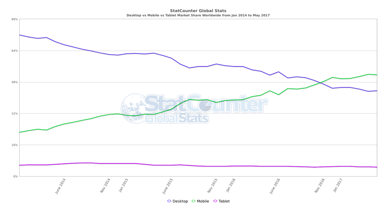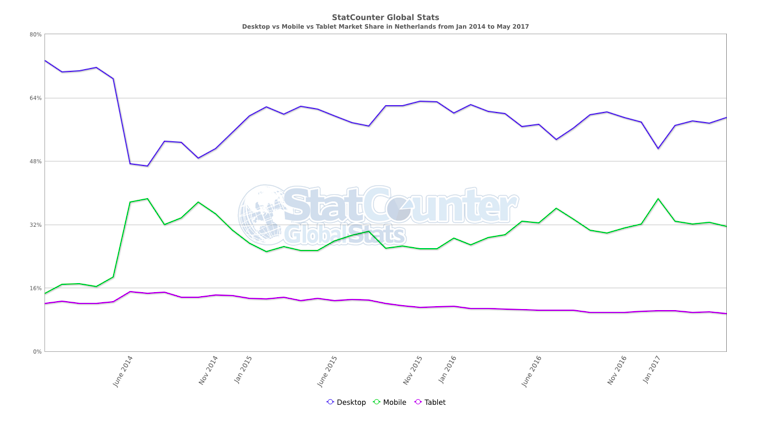 Volgens Statcounter is wereldwijd gezien eind vorig jaar het kantelpunt gekomen waarbij het mobiele marktaandeel de desktop is voorbijgestreefd. In Nederland ziet het beeld er wat anders uit: in ons land is desktop nog steeds dominant, al kruipen desktop en mobiel wel verder naar elkaar toe. De voornaamste oorzaak van het verschil tussen Nederland en de rest van de wereld is de enorme adoptie van mobiel in Azië.