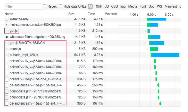 Externe scripts, bijvoorbeeld van advertentienetwerken en sociale plugins, kunnen je website enorm vertragen. Om dit te achterhalen open je in Google Chrome de ontwikkelaarstools. Op Windows doe je dit via F12, op Mac met CMD+ALT+i. Als je daar in de netwerk-tab kijkt, zie je een waterval van alle script en plaatjes die worden gelaten. Let vooral op de scripts die als laatste klaar zijn. Dit zijn de scripts die waarschijnlijk voor de grootste vertraging zorgen en waar je je van moet afvragen of ze echt nodig zijn.