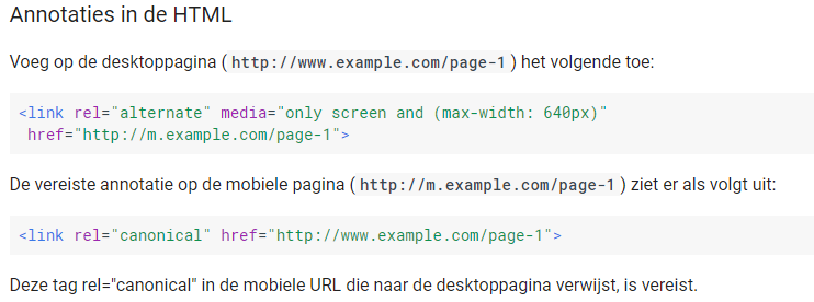 - Implementeer rel=alternate & canonical tags tussen de mobiele en desktop pagina’s