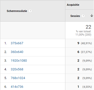 Ook in Google Analytics kun je waardevolle informatie halen voor je mobiele website. Zo kun je bekijken welke resoluties het meeste voorkomen bij je bezoekers.