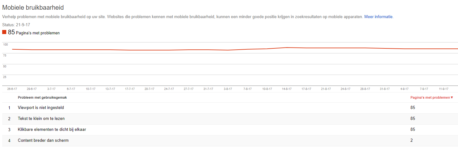 In Google Search Console kan je waardevolle informatie vinden over je mobiele website, waaronder de Mobile Usability report. Deze kan je vinden onder ‘Zoekverkeer’ > ‘Mobiele bruikbaarheid’. Dit ziet er dan bijvoorbeeld als volgt uit: