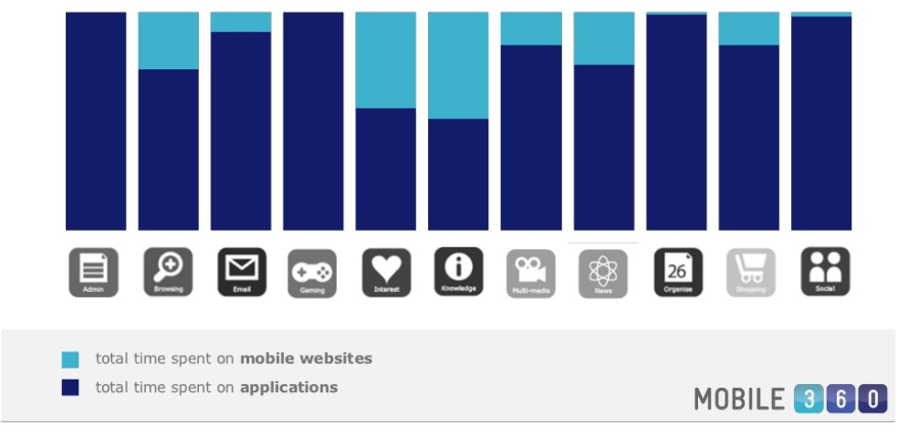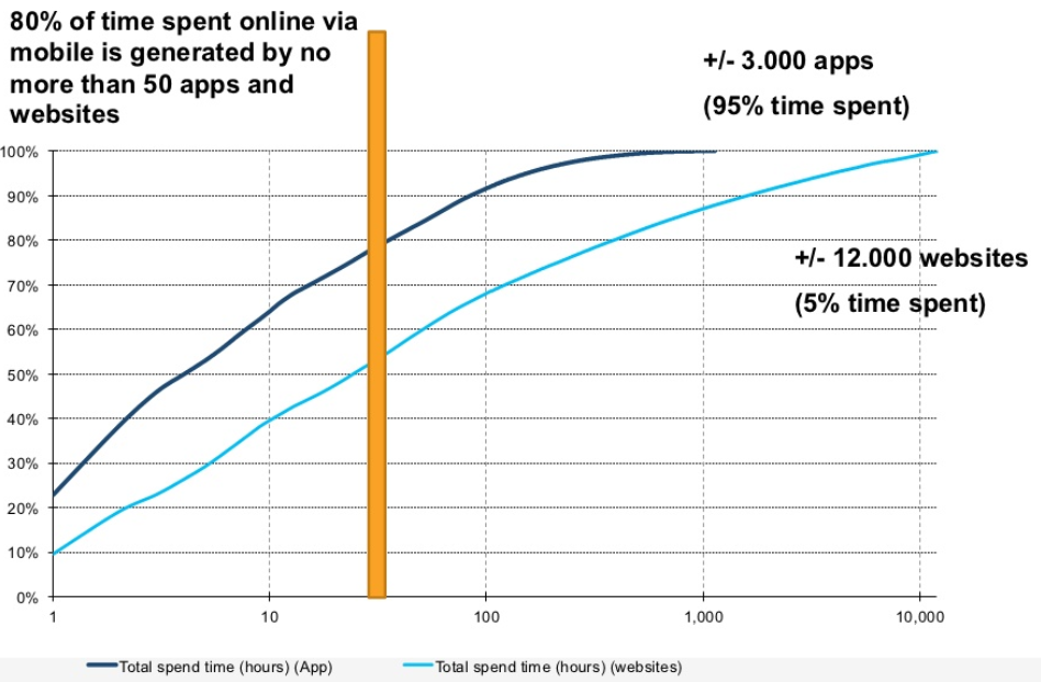 Uit het onderzoek blijkt tevens dat 95% van de tijd wordt gespendeerd aan apps, slechts 5% gaat naar mobiele websites. Als we kijken naar de totaalsom van gebruik zien we dat 80% van de de tijd die aan apps wordt besteed, naar niet meer dan 50 applicaties gaat. In totaal werden in het panel 3.000 apps gebruikt. De variëteit binnen websites was veel groter, met de browser werden totaal ±12.000 websites bezocht.