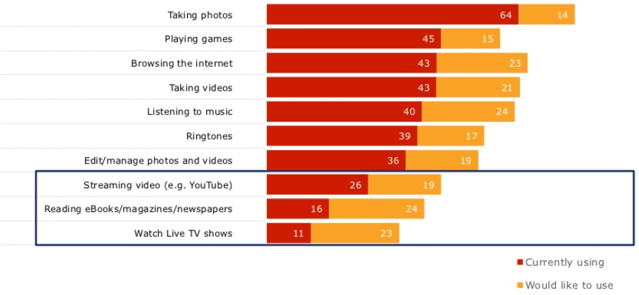 Het maken van foto's en het spelen van games zijn op dit moment de populairste features van mobiele apparaten. Meer intensieve features zoals het streamen van video, het lezen van ebooks en kranten en het live kijken van tv-shows zijn nog minder populair, maar daar wordt wel grote groei verwacht.