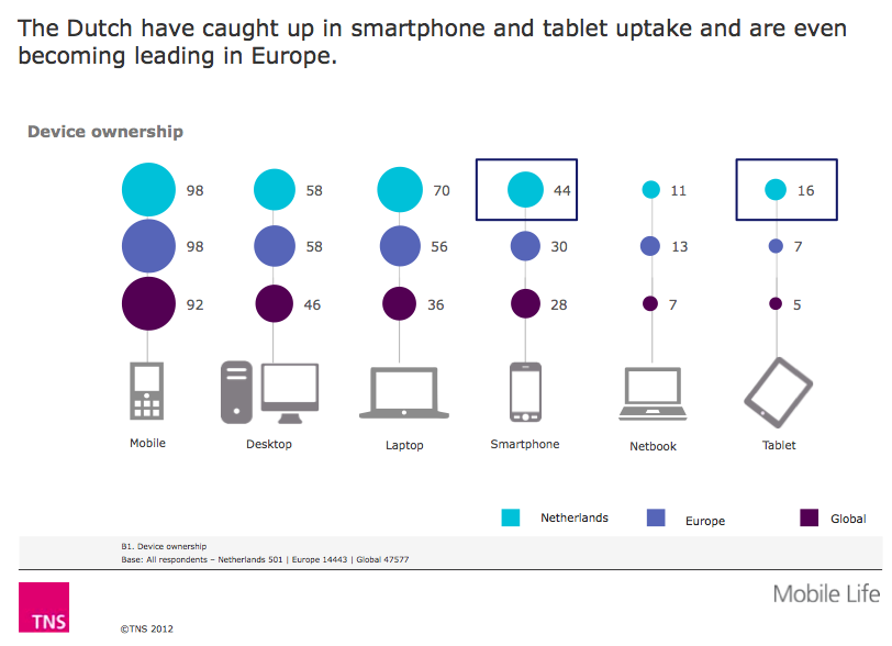Deze week vond in Amsterdam het eerste Mobile First-event plaats. Tijdens dit nieuwe event deelden o.a. TNS NIPO en Wakoopa interessante cijfers over het gebruik van mobiele apparaten in Nederland. Zo blijkt uit cijfers van het Mobile360-onderzoek dat Nederlanders qua adoptie van smartphones en tablets voorlopen op de rest van Europa.