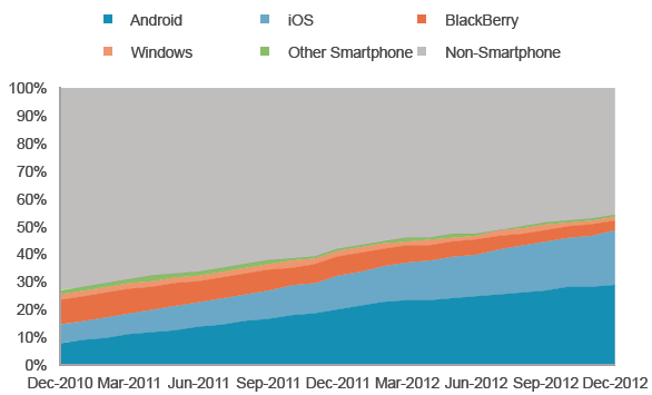 Inmiddels heeft meer dan de helft van de Amerikanen een smartphone, waarmee de smartphone zich nu in de “late majority” fase van de technologie adoptiecurve bevindt. Het aantal smartphone-abonnementen is het afgelopen jaar met 29 procent gegroeid en 99 procent ten opzichte van 2 jaar geleden.