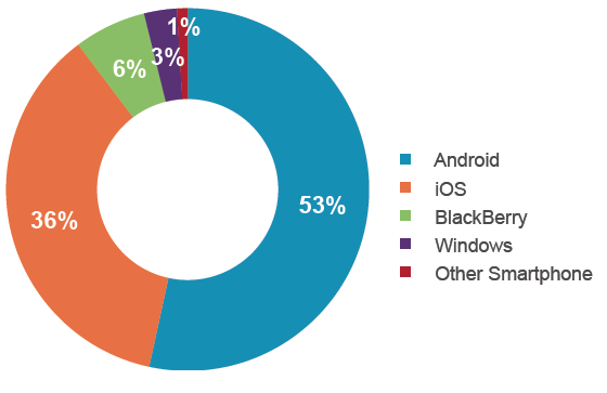 Het aandeel van Blackberry OS is gezakt tot 6 procent. Windows Phone ontwikkelt zich nog langzaam. Het huidige marktaandeel bedraagt zo'n 3 procent.