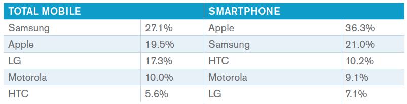 In december 2011 kwam 1 op de 4 Android smartphones van Samsung, inmiddels is dit 2 op de 5. Afwezig in de top smartphones lijst is Blackberry, die vorig jaar nog op plek #2 stond.