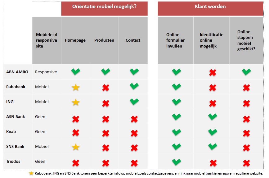 We hebben de websites van de zeven grootste banken onder de loep genomen. Enerzijds hebben we onderzocht in hoeverre de sites geschikt zijn voor mobiele telefoons. Vervolgens hebben we onderzocht of het ook mogelijk is om bij die banken klant te worden via het mobiele kanaal. De resultaten voor het eerste deel zijn opmerkelijk: slechts een van de zeven banken beschikt over een responsive site. Drie hebben een aparte mobiele website en nog eens drie hebben helemaal geen actie ondernomen om het de mobiele bezoeker aangenaam en makkelijk te maken.