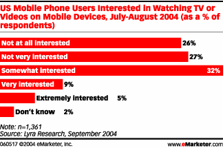 With camera phones growing in popularity, can phones that receive TV services be far behind? Actually, it seems that most mobile phone users in the U.S. aren’t really interested, according to aggregated data in the eMarketer eStat Database. A Lyra Research survey of 1,361 U.S. mobile phone users found that over 50% are either “not at all” or “not very” interested in watching TV on their mobile phones or other handheld devices. Only 32% showed some interest and a mere 9% are very interested in mobile TV services. Among the hurdles operators will have to overcome are consumer skepticism about the quality of programming and growing concerns about inappropriate phone usage. The news isn’t all bad, though: younger adult respondents to the Lyra Research survey displayed the strongest level of interest in mobile TV, making them the best target for marketing efforts.