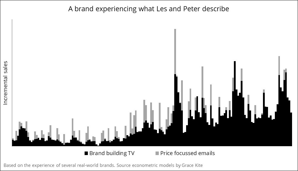 Zij stelt bijvoorbeeld dat er veel merken zijn die wel jarenlang significant groeien door zich puur op verkoopactivatie te richten. En voor andere merken is een structurele investering in merkbouwen te riskant. Niet elke campagne werkt of is financieel vol te houden.