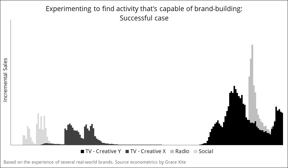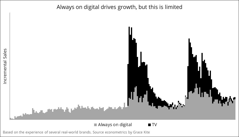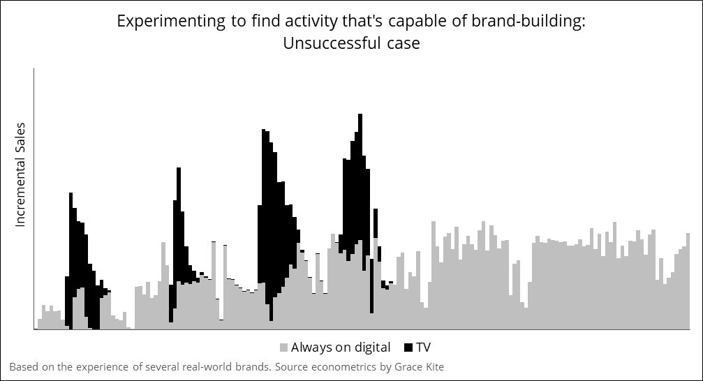 Het volgende plaatje toont daarentegen een ander beeld dan het model van Binet en Field: dit is een merk dat wel jarenlange groei behaalde door zich alleen te focussen op verkoopactivatie.Deze benadering kan volgens Kite lonen, als er ‘laaghangend fruit’ is om van te profiteren. Bijvoorbeeld omdat er altijd een groep klanten is die een mogelijke aankoop onderzoekt of die geen duidelijke merkvoorkeur heeft. Het voordeel van deze route is volgens haar dat met data-gedreven instrumenten voor search, social, display en online video goed is uit te rekenen wat een investering uiteindelijk oplevert qua verkoop.