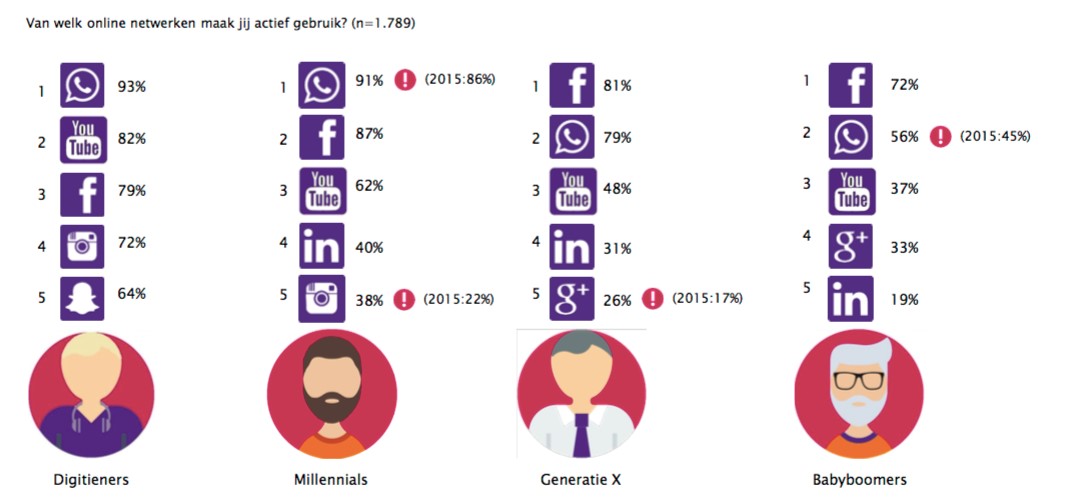 Uit het ‘Whats Happening Online’-onderzoek van Ruigrok NetPanel blijkt dat Facebook nog steeds de meeste gebruikers heeft. Samen met WhatsApp domineert Facebook het socialmedialandschap. Maar liefst 93 procent van alle ondervraagden uit het onderzoek geeft aan WhatsApp actief te gebruiken.