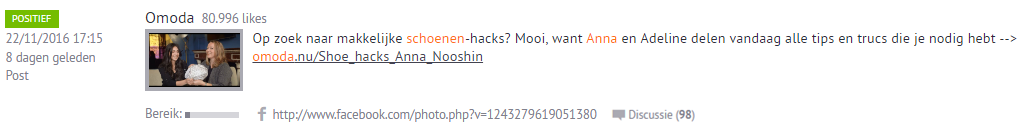 Het monitoren van (potentiële) influencers en hun online discussies zullen in 2017 nog belangrijker worden. Influencers hebben grote invloed op merkimago en zorgen voor een hoog engagement met een merk. Bij een juiste inzet van influencers boost je het positieve sentiment en genereer je verkopen. Zo zet Omoda Anna Nooshin in voor branding en het vergroten van de online en offline verkopen.